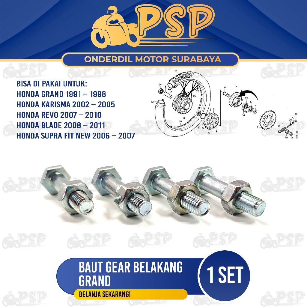 NAMA PRODUK : Baut Ger Belakang Grand Silver (1 Set) – Baud Nap Gear Gir Honda Astrea Blade Revo Supra X Fit New